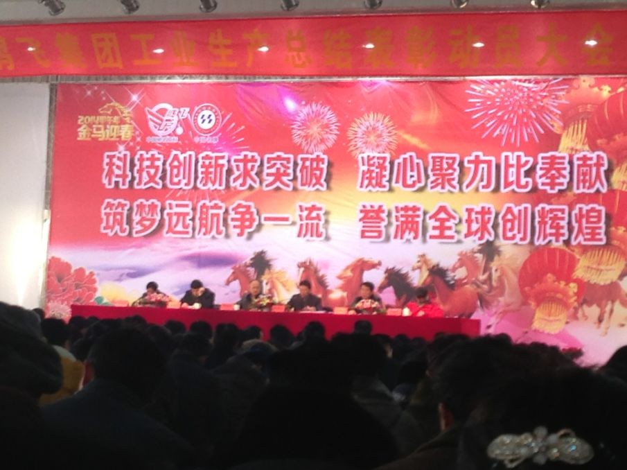 江蘇鵬飛集團(tuán)工業(yè)表彰大會(huì)2014年正月初五勝利召開。大會(huì)主題是:科技創(chuàng)新求突破,凝心聚力比奉獻(xiàn),筑夢(mèng)遠(yuǎn)航爭(zhēng)一流,譽(yù)滿全球創(chuàng)輝煌。江蘇鵬飛集團(tuán)股份有限公司董事長(zhǎng)、總經(jīng)理宣布:江蘇鵬飛集團(tuán)于正月初六正式上班!