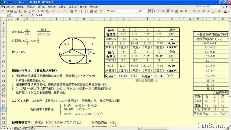如下圖:有效半徑D和有效倉長L是已知數(shù),試用輸入球面凈空高y的數(shù)據(jù)可得出你要求的填充率&,同時也得出了研磨體的填充量。(凈空高與填充率基本是同一個概念,而凈空高在實際生產(chǎn)中更實用,說不定哪天就要打開磨門量一下,補(bǔ)上一些鋼球!)。然后根據(jù)入磨材料的粒徑求出平均球徑,根據(jù)平均球徑的要求以“兩頭小中間大的原則”可得出各種球體的級配。而這些求解方法都可以利用Excel的自動計算功能設(shè)定后方便地進(jìn)行。