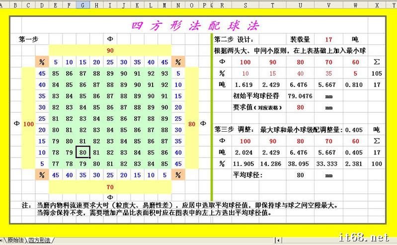 第一步:設(shè)定四種連續(xù)規(guī)格的研磨體,按照四方形的分配原則,它們的總和是100%。如下圖,可得出平均球徑的結(jié)果,有幾組級配不同但平均球徑結(jié)果相同的組合,根據(jù)工藝生產(chǎn)要求選取合適的級配。(可設(shè)定自動統(tǒng)計表,只需輸入四種研磨體的規(guī)格直徑,即可得出一系列的平均球徑結(jié)果)。