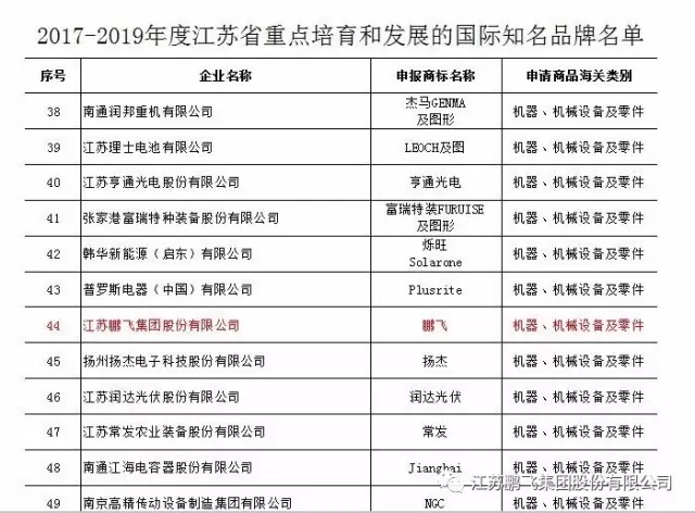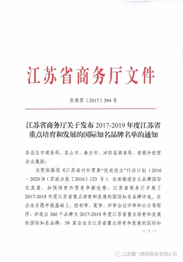 近日,省商務廳公布“2017-2019年度江蘇省重點培育和發(fā)展的國際知名品牌”名單,經(jīng)過層層評比,江蘇鵬飛集團榮膺在列。