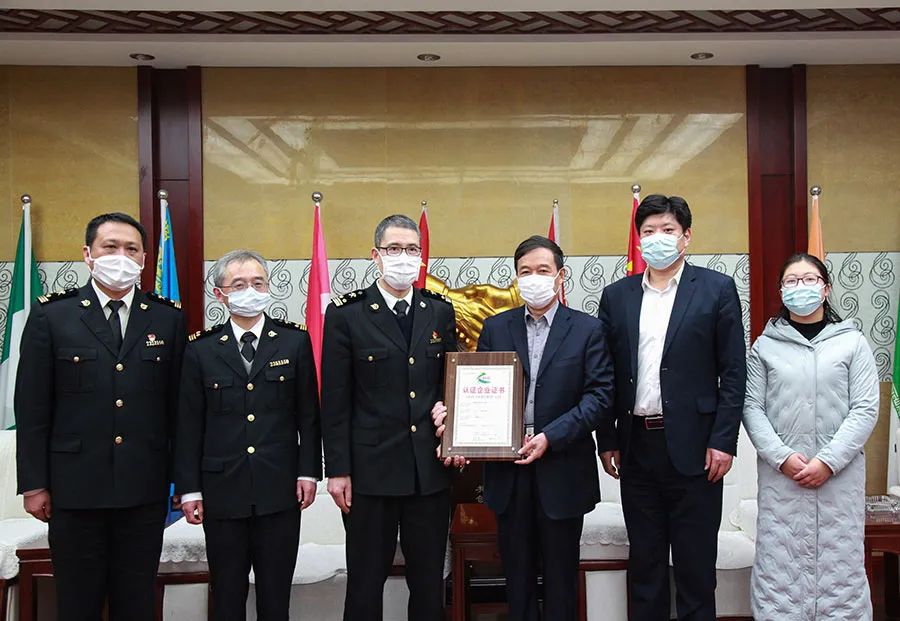2021年1月19日南通海關(guān)駐海安辦事處楊占臣主任等一行專(zhuān)程到鵬飛頒發(fā)高級(jí)認(rèn)證企業(yè)證書(shū)。