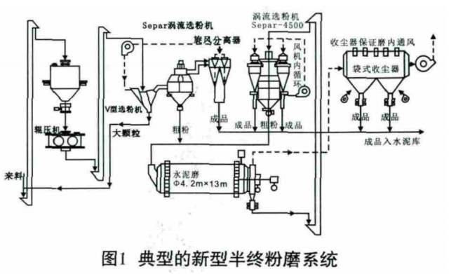(4)隨著水泥粉磨工藝研究的不斷進步,對傳統(tǒng)聯(lián)合粉磨系統(tǒng)的不斷優(yōu)化,“大輥壓機配小球磨機”的半終粉磨系統(tǒng)脫穎而出。與傳統(tǒng)聯(lián)合粉磨工藝系統(tǒng)相比,輥壓機半終粉磨工藝采用一臺物料處理能力較大的輥壓機和一臺喂料、分選能力大的下進風雙分離高效選粉機,將V選后的細粉再次進行分選,合格細粉從入磨前的物料中被分選出來并直接送入成品庫,中粗粉進入球磨機進行粉磨,大幅度提高了成品產(chǎn)量,改善了球磨機的工況,減少了過粉磨現(xiàn)象的發(fā)生。同時V型選粉機與雙分離高效選粉機共用一臺系統(tǒng)風機,取消了聯(lián)合粉磨系統(tǒng)中一臺循環(huán)風機與旋風收塵器及部分管道和輸送設備,進而提高了球磨機的綜合臺時產(chǎn)量,降低了粉磨電耗,減少了設備數(shù)量和維修成本。典型的新型半終粉磨系統(tǒng)如圖1所示。